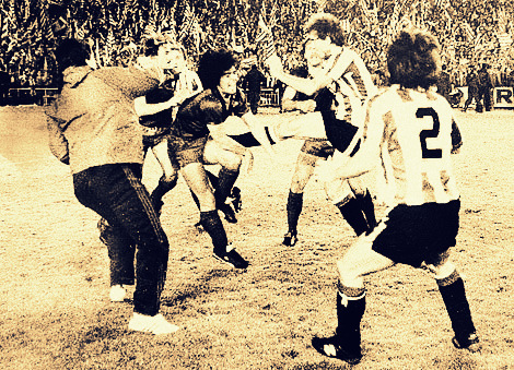 Whether motivated by the prospect of a rare domestic double, a grievance over Maradona’s participation or just the noisy support of the bulk of the crowd in the Bernebau, Bilbao deserved their tetchy 1-0 win, arriving via a 13th minute Endika goal. The final whistle brought the game and the season to a close, but not yet this angry rivalry. Maradona cut a frustrated figure at the end; beaten by Bilbao to another trophy and bleeding from a leg wound he claimed had been inflicted on him by, who else, Andoni Goicoechea. When Bilbao defender Sola gestured mockingly at him, this proved a provocation too far in a season full of them. He head-butted Sola and elbowed another Bilbao player in the face. As a group of Bilbao players led by Goicoechea surrounded him to exact some primal retribution, Maradona’s teammates joined in the fray with gusto. Migueli and Clos literally flew on to the scene with wild kung-fu kicks and the resultant pitched battle played out like a surreal, Hispanic martial-arts movie.