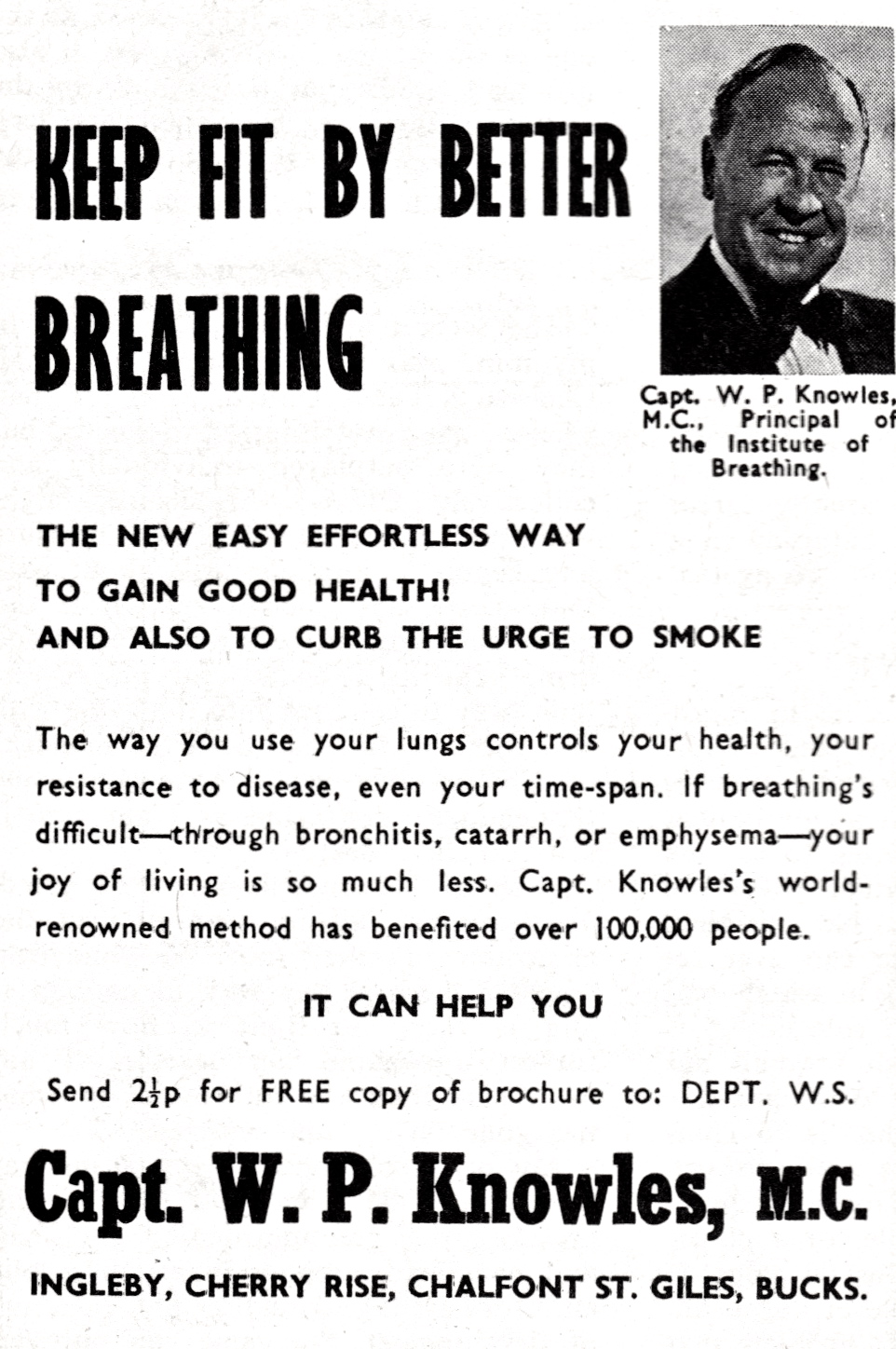 Post-war football magazines rarely published an issue that did not contain multiple adverts promoting some sort of path to a healthier and happier lifestyle for all. BTLM has a favourite here: it’s Captain W.P.Knowles and his brochure on How To Keep Fit By Better Breathing. Come on now Captain Knowles, it’s got to be more a pamphlet than a brochure surely? How much space do you need to print ‘Breath In….Breath Out…’