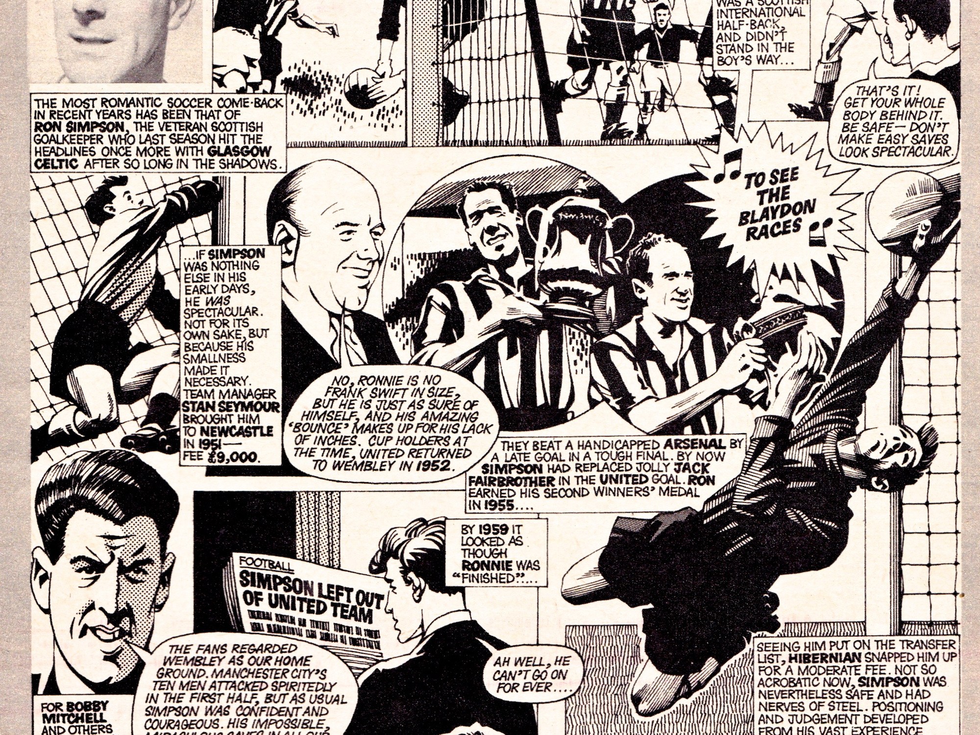This particular Star Strip was published in 1966 and while it alludes to Simpson’s remarkable longevity and bounce-backability, no-one could have anticipated that a keeper in his mid-30s still had his best years ahead of him. BTLM is especially curious about the frame on the top line that references Simpson’s emergent career in Glasgow. For reasons unknown, the accompanying crowd speech-bubble commentary from what would be a Glaswegian terrace seems to be supplied by a proper Cor Blimey Guv’nor cockney!