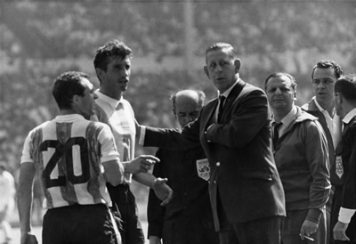 Kreitlein refereed the 1966 group stage encounter between the Soviet Union and Italy without significant incident, but England’s highly charged match against Argentina would be a very different beast for the German. More than any other nation, Argentina represented the global shift towards a defensive, pragmatic, win-at-all-costs mentality with intimidation and underhand tactics a significant part of their game plan. There was little underhand about England and what you saw is what you got. Their particular brand of violence was more conventional and came from a willingness to tackle from behind, charge the goalkeeper and routinely make two footed tackles: all dressed up as good, honest contact in a game for proper men. Both countries took the position that their own brand of violence was perfectly righteous and this was a clash of cultures that would need careful and nuanced officiating.