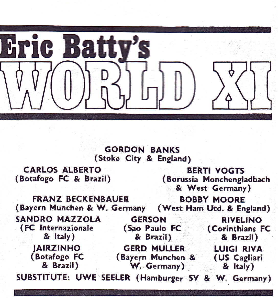 For much of this decade West Germans would dominate Eric’s selections and Beckenbauer and Gerd Müller specifically were fixtures in most of them. In 1971 Berti Vogts joined them at left-back and Uwe Seeler gets a special mention as a substitute based on his 1970 World Cup performances – one of only three times Eric nominated subs with his fantasy teams. Brazil’s recent World Cup win is reflected strongly: oddly Pelé doesn’t get a nomination but Carlos Alberto, Gerson, Rivelino and Jairzinho all do. Gerson is a classic Batty choice as a deep-lying midfielder, wonderfully gifted but never willingly attempting a tackle in his life as Eric himself does concede.