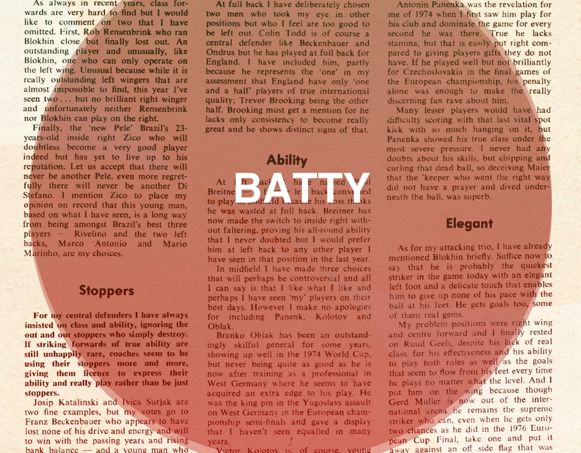 Batty likes his Slovan Bratislava players. Anton Ondrus earns a place in 1976, apparently because he once scored 4 goals in a club game from his central defensive position. Panenka is the sort of mercurial playmaker that made Eric’s stout heart beat a little quicker and he’s duly selected despite an acknowledgement that he lacks stamina. Dynamo Kiev’s rise as a force in the European game is reflected in the inclusion of Viktor Kolotov and Oleg Blokhin.
