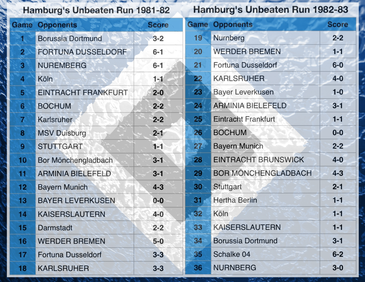 Hamburg’s 36 game run started in January 1982 and lasted for a calendar year through to the January of the following year. There was a certain symmetry to the figures behind it with 18 of its games coming in the second-half of the 1981-82 season and the other 18 in the first-half of 1982-83. The results were identical too with ten wins and eight draws recorded in each half of the run.