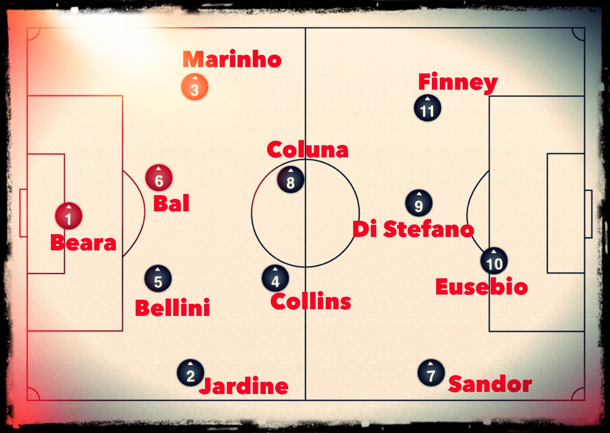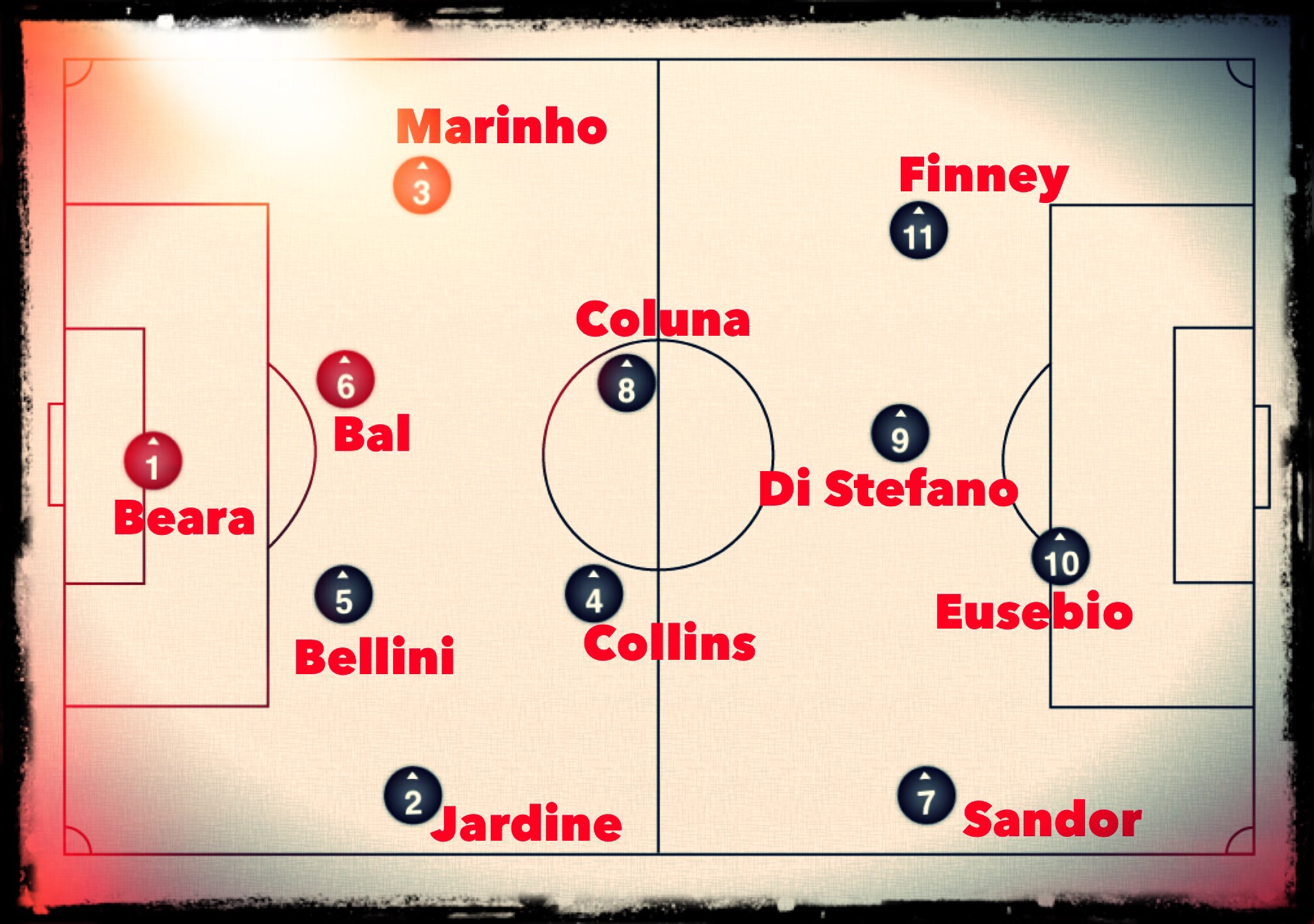 It’s an ominously strong team for this year with the attacking half looking especially potent. The sheer pace and directness of Eusebio, the movement, flexibility and trickery of Finney and the all-round brilliance and leadership of Di Stefano would drive any defence in the world, from their time or from ours, to distraction.
