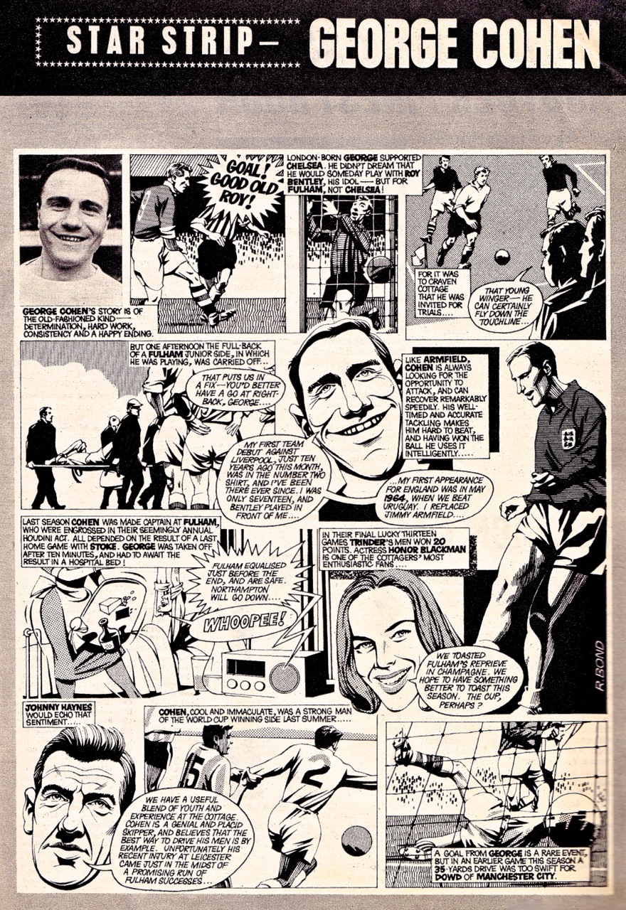 EnglandEngland international right back George Cohen is the subject of this Star Strip edition and it’s certainly one of artist Bob Bond’s more expansive efforts. While the Fulham man was a fine player and model professional, his life story was less incident packed than many of the players we have featured in the series. Perhaps conscious of the lack of drama, Bob really goes to town on pushing the abstract and Cohen’s strip duly features a frankly disconcerting frame of the player drawn in a Cheshire Cat style; another of him scattering the contents of his hospital room when celebrating his team avoiding relegation and an odd cameo by the actress Honor Blackman.
