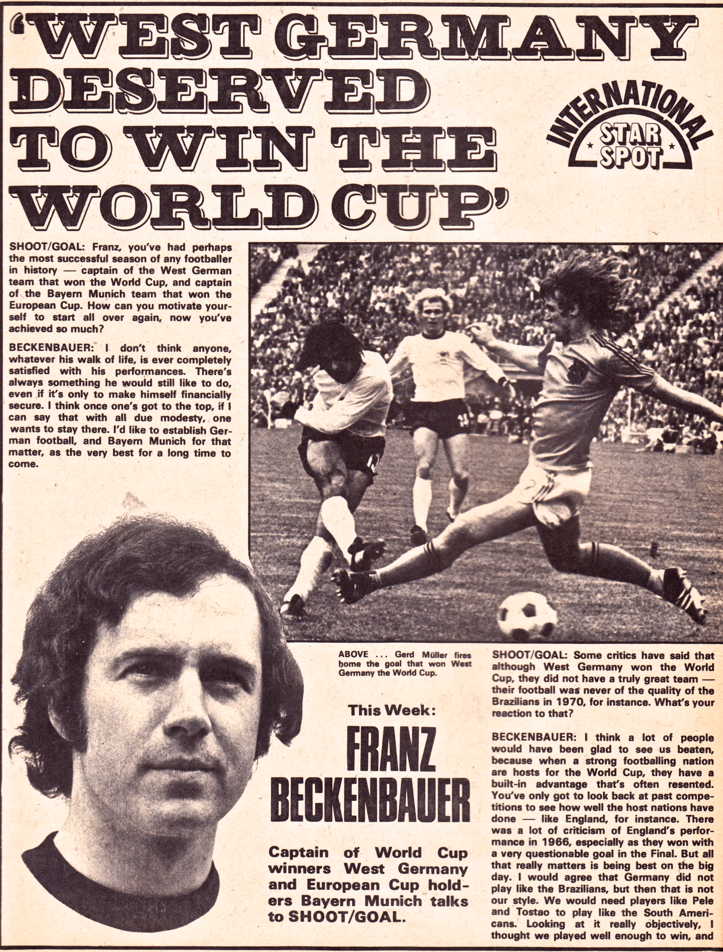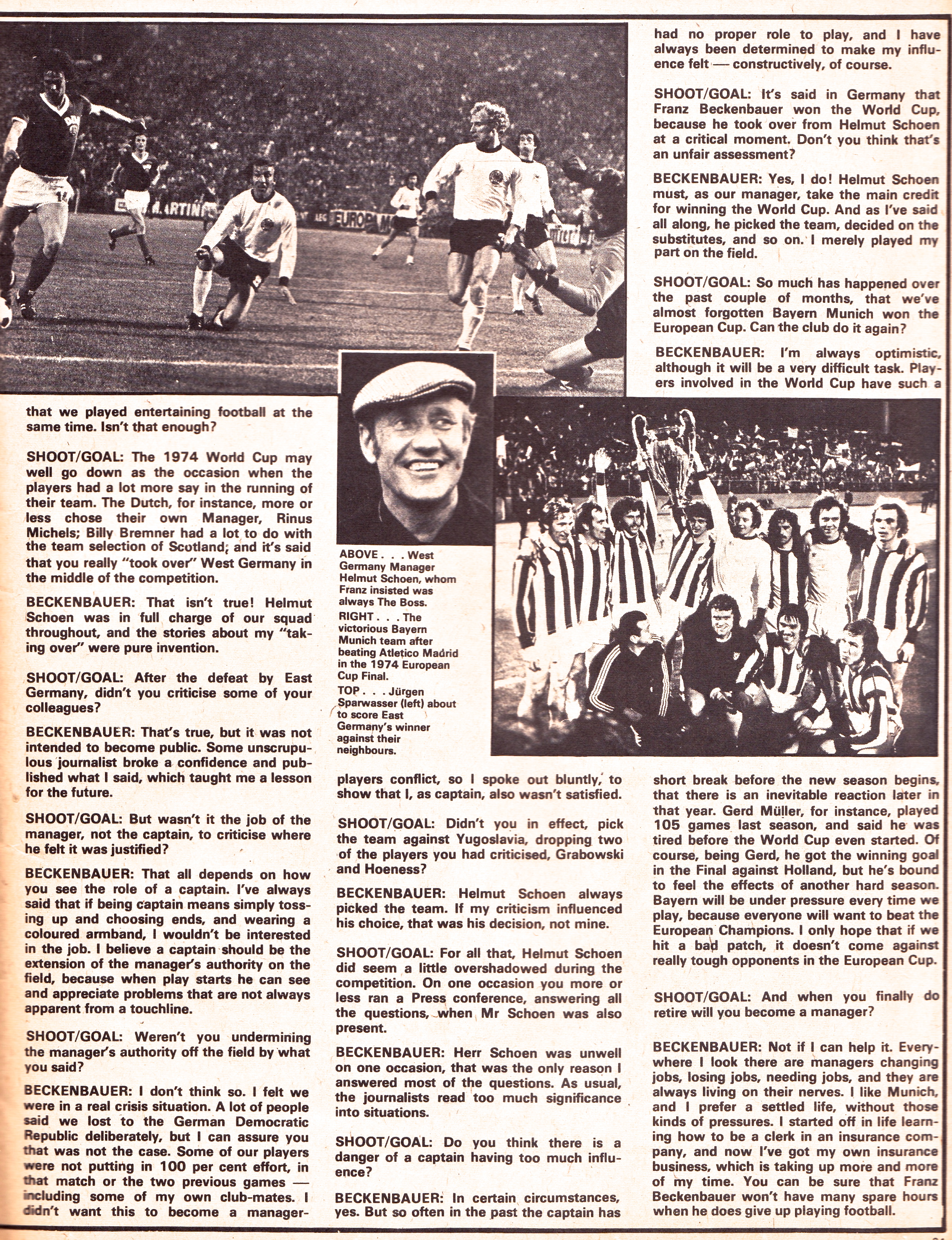 It didn’t always used to be that way back in the days before betting bonuses, as this fascinating 1974 Shoot magazine interview with Franz Beckenbauer (below) ably demonstrates. The unnamed interviewer appears to have a near pathological obsession with the rumours that the West German legend undermined the authority of his national coach, Helmut Schön, during the recent World Cup. Normally a player’s contradiction with accompanying explanation would be deemed sufficient to move the line of questioning on to other topics, but not on this occasion. The interviewer is stuck on this single theme and essentially asks the same question in slightly different ways SEVEN times in succession.