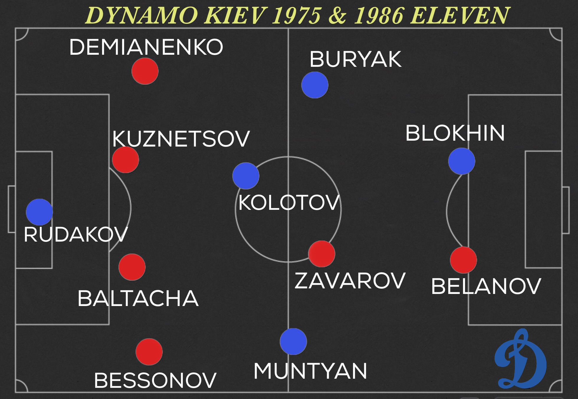 On the graphic the players marked in blue are from 1975 and the players in red are from 1986. We have selected the 1975 version of Blokhin as he was at the peak of his career then. The formation we chose could only be the classic Kiev 4-4-2.