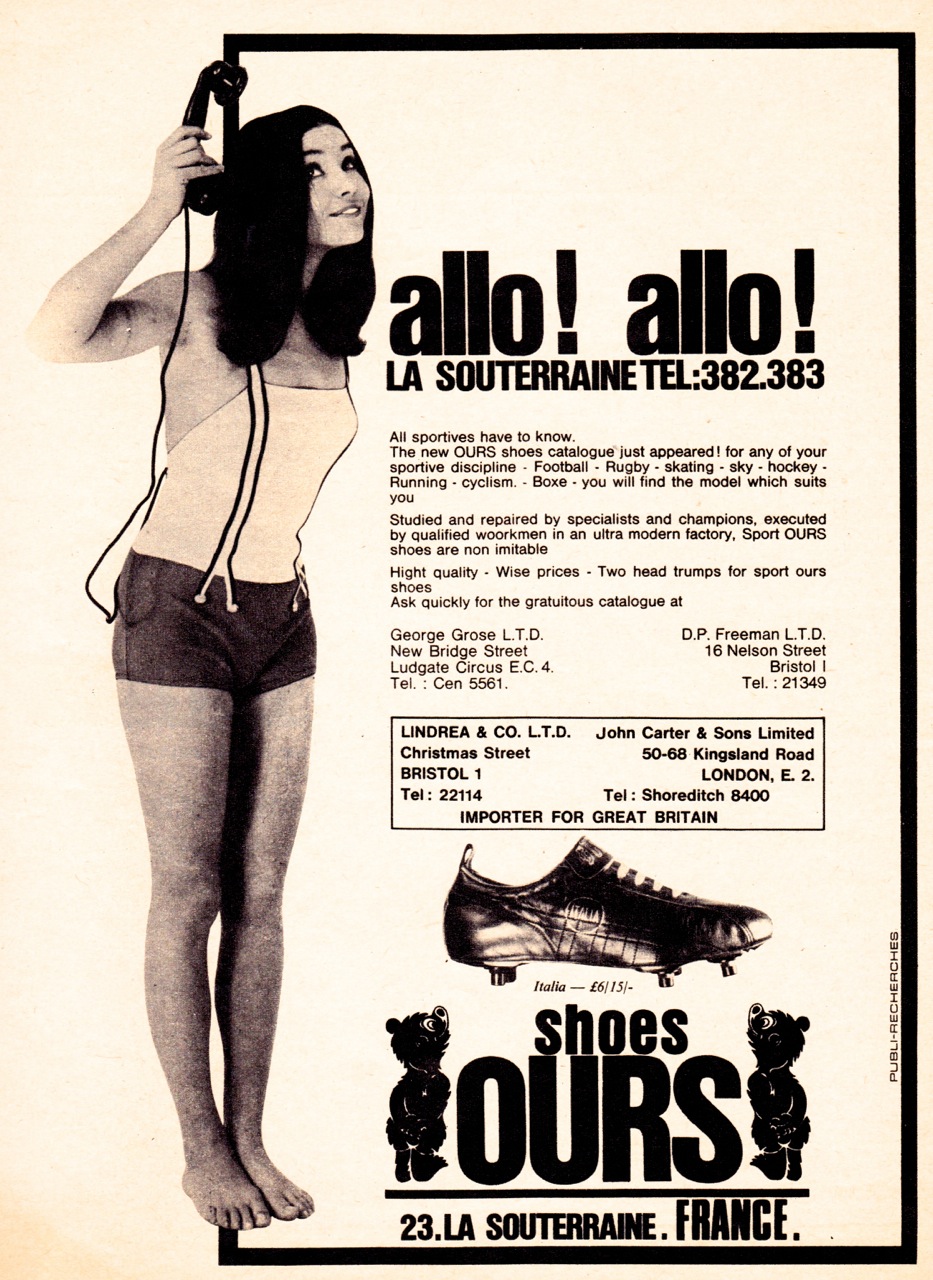 A Word From Our SponsorsOur latest retro football boot advertising hark-back throws up something of an oddity as we’re featuring the French firm Chaussures, active in European markets for a handful years in the late 1960s and early 1970s. It’s something of a surprise that they sold any boots at all, what with their quite terrible advertising campaigns.