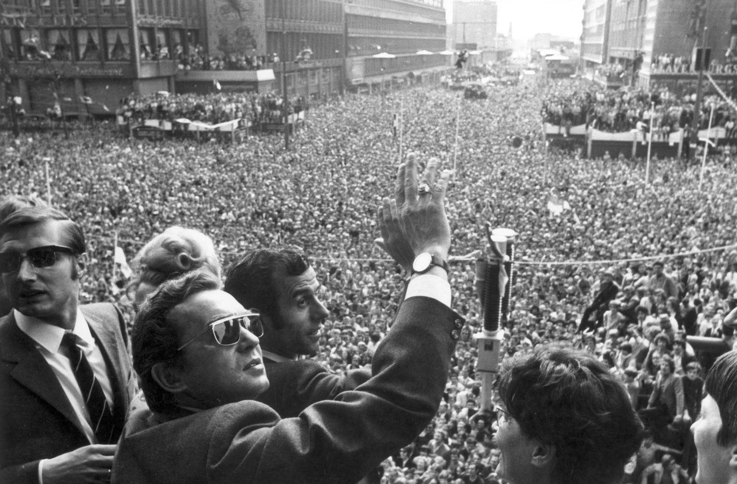 At the airport, along the motorways and congregating in the heart of the city: every conceivable vantage point is claimed as hundreds of thousands of people turn out to see the trophy and acclaim their heroes. With the massed ranks of fans packed in as far as the eye can see in any direction, the sheer human scale captured in these images is breathtaking.