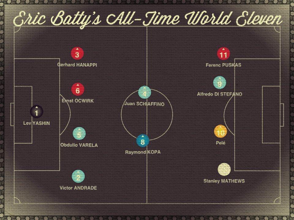 This is the fifth and final article in the BTLM series dedicated to Eric Batty and his famous World XIs published in World Soccer magazine between 1960 and 1992. Eric nominated a best team for each individual year and once, in 1983, he named a World XI of World XIs – his all-time favourite players drawn from six decades of watching the game. It’s interesting to note that Uruguay and Austria are the only nationalities represented by more than a single player in his line-up.
