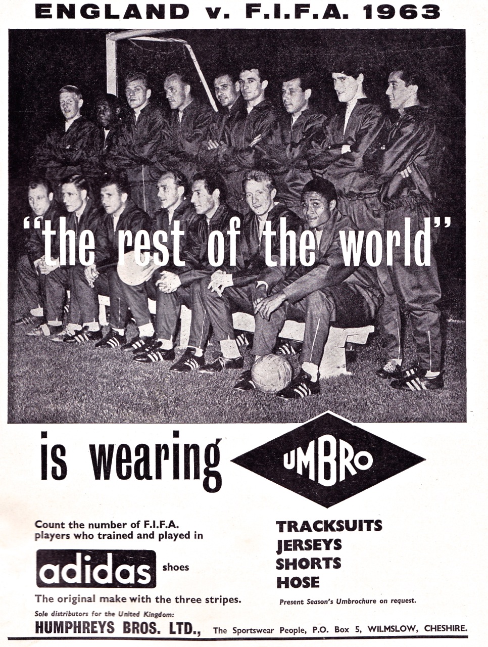 Another high-profile game that Umbro exploited to best commercial effect was the FA Centenary match in 1963 between England and the Rest of The World. Used to having predominantly British stars wearing their shirts, this was a real coup to have world stars like Di Stefano and Eusebio sporting them for this one-off game.