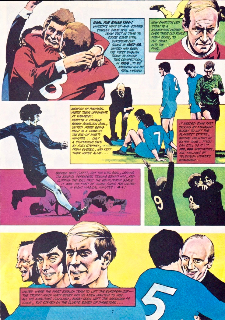 The football annuals most of us will have received as presents every Christmas without fail from unimaginative relatives did offer up greater scope to the illustrators though. More space to play with meant bigger subjects could be tackled, like the entire history of a football club as demonstrated here with the story of Manchester United from their formation through to 1976 when this Star Strip was first published.