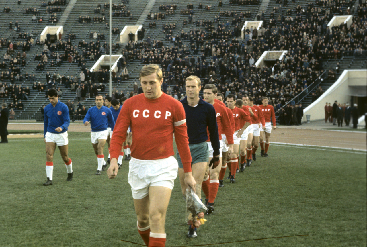 Albert Shesternev leads out the Soviets before a 1966 international v Turkey
