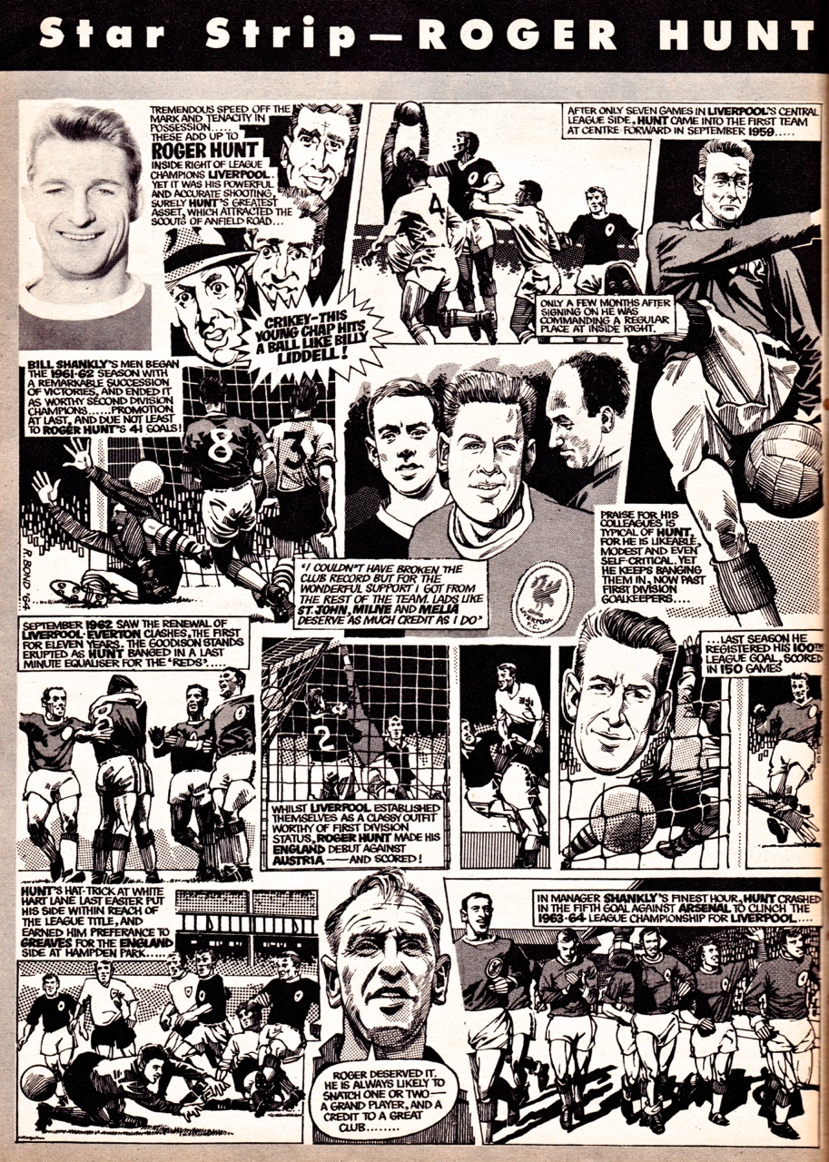 Our latest Star Strip captures a snapshot of Liverpool striker Roger Hunt’s career as it neared its peak. This was 1964 and it was a particularly fine year for the prolific and consistent forward. Hunt had arrived at the club back in 1958 and was one of the few players to survive the clear-out Bill Shankly instigated when he was appointed as manager a year later. The striker scored on his debut and rarely stopped scoring all the way through his 11 year Liverpool career. His goals took Liverpool to the Division 2 title in 1962 and the step-up in class proved no impediment to the flow of goals. Just two years after promotion Liverpool won the Division One title and once again Roger Hunt’s goals played a decisive role in that success.