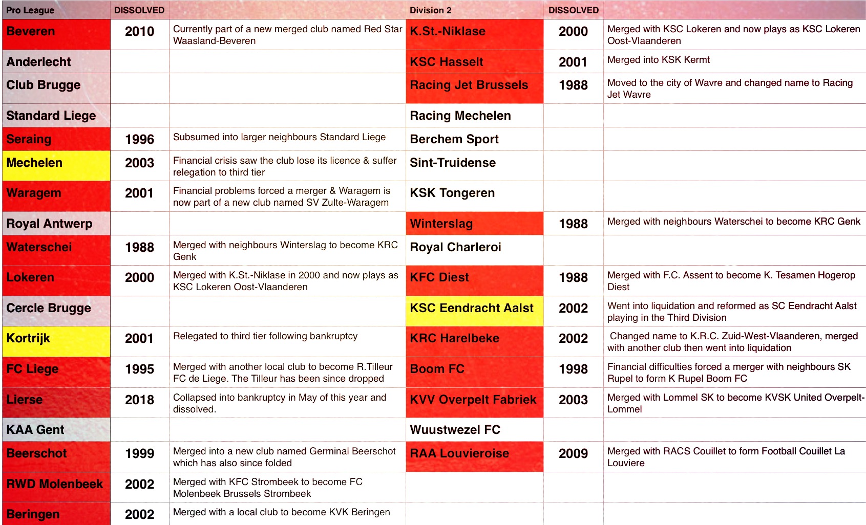 YELLOW: Indicates a club that maintains its previous identity but has, at some stage, gone bankrupt and/or lost its professional licence because of financial problems.