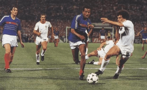 One of Tigana’s and France’s most memorable matches was the semi-final clash against Portugal, a match now regarded as one of the greatest in international football. The Magic Square continually created chances only to be thwarted by the opposing keeper. Finally, a breakthrough as a sweetly struck free-kick from Jean-François Domergue handed France the lead. A dogged Portugal equalised through Rui Jordão, the game went to extra-time and France finally won it 3-2 with a late Platini strike.