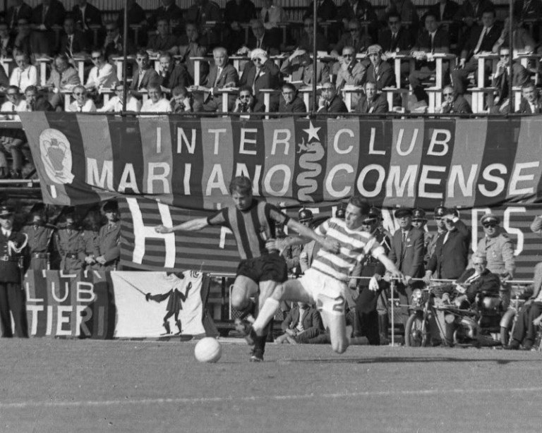 Stein had promised that Celtic would “be the first team to bring the European Cup back to Britain” and that they would do it by attacking as they had never attacked before. It was certainly a bold statement and one which offered hope to the thousands of travelling Scots, but it was Inter that started the match with intensity. Inside right Sandro Mazzola, another of the world-class players making up the Inter side, headed an early chance straight at goalkeeper Ronnie Simpson. Shortly after, with just six minutes of the game gone, Inter were awarded a penalty after a foul on Renato Cappellini with Mazzola sending Simpson the wrong way to give Inter the early lead.