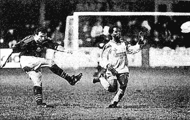A hamstring injury meant Waterford missed the services of Quitongo for nearly six weeks, but having just turned 21 he marked his return with two goals against St. James’s Gate at the Iveagh grounds in December 1994. It was quite a remarkable return which included an overhead kick converted just 45 seconds into the game. Though he would put the Blues further ahead on 24 minutes, St. James’s came back to tie the game at two goals apiece.