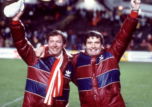 Aberdeen’s Manager Alex Ferguson & Trainer Archie Knox celebrate victory against Real Madrid