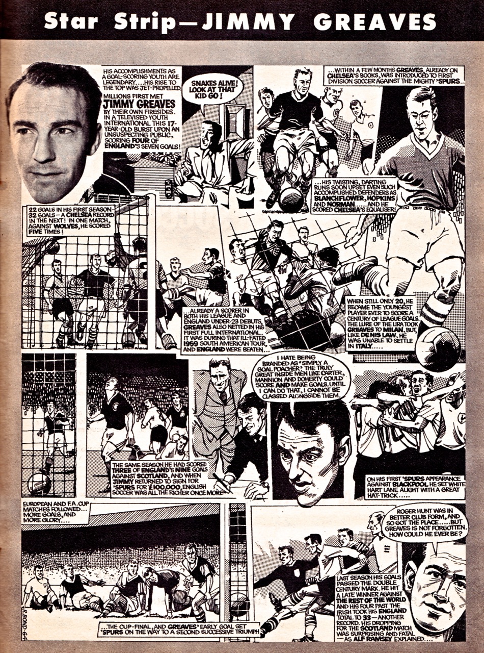This 1964 edition featuring the life and times of one of England’s greatest strikers suffers a similar problem for slightly different reasons. Whichever team Jimmy Greaves was playing for or against hardly mattered as any combination still usually resulted in a cascade of goals for this striking juggernaut. The consequence here is that virtually every frame is compelled to inform us of yet another Greaves goalscoring feat, landmark or record. It’s a perfectly accurate rendering of the highlights of the striker’s career to that point, but it does read as something of a one-track story.