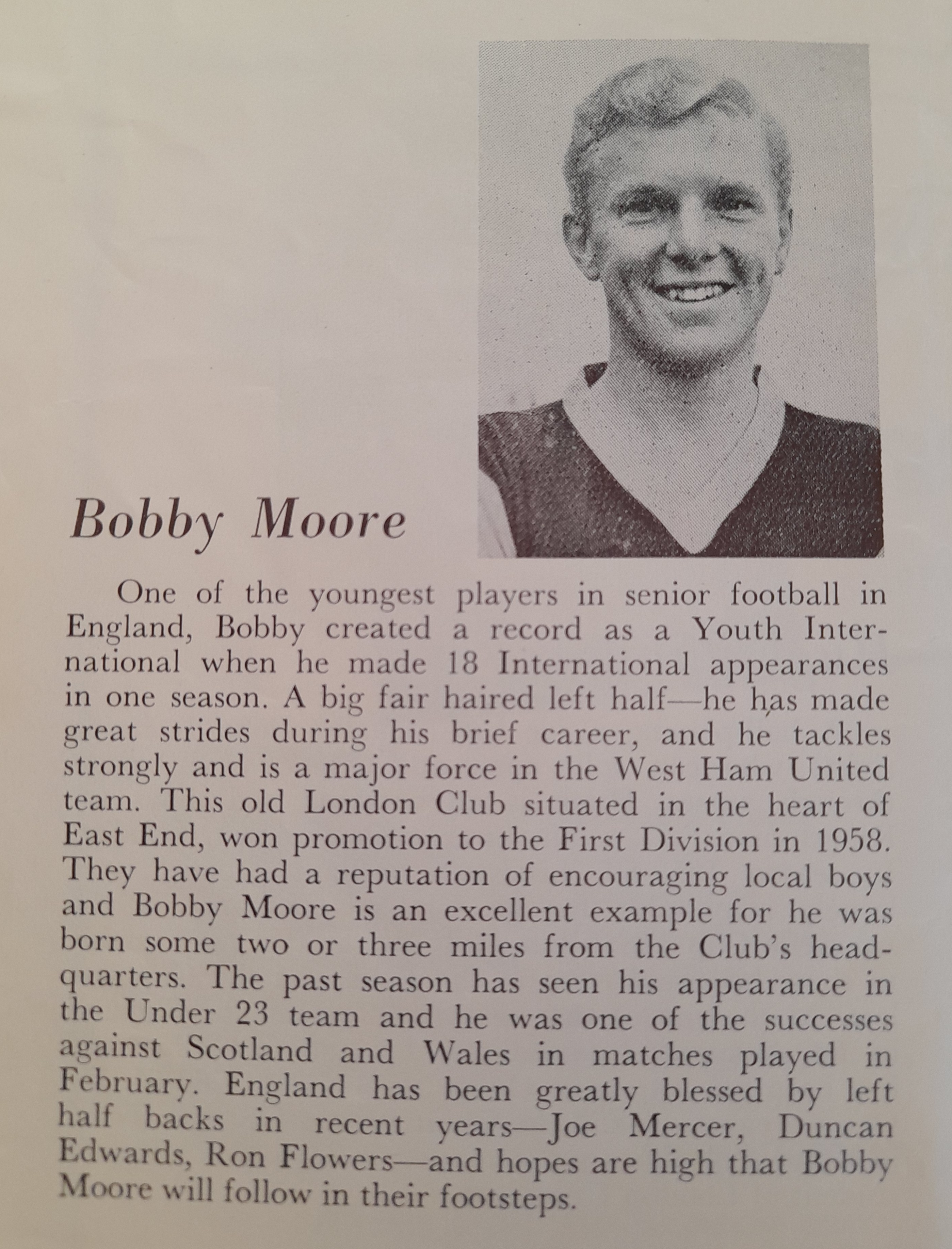 “English Park had a cycle track around it,” he said. “After a few minutes Peter Flynn played a long ball down the right wing and I raced after it. Standing there, waiting to pull the ball out of the air, was Bobby Moore, and as he did so I hit him on the shoulder and he flew off the grass on to the cycle track. He raced back on to the park and said to Tom Finney ‘Who the effin hell hit me?’. Finney winked at me and said to Moore ‘Too late, son, he’s gone’ and told him to go and get a bandage on his bleeding arm.”